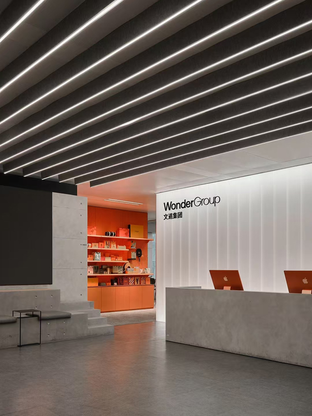 文道集团的创立源于对餐饮行业热爱,创始人姜浩文为90后,堪称最年轻成就企业家称号,英国留学回国就参与餐饮行业,在父辈的指引下迅速成长,经过多年对行业的探索,创建文道集团,基于餐饮行业的原因,办公室设计采用橙色为主题色,设计简洁明了,同大家想法一样,空间缺乏艺术设计气息,这并非设计师想不到,空间设计多次于甲方接触,深入理解甲方意图,融入甲方理念,空间是为使用者打造,并非为了好看去设计,美观性设计并不缺少。