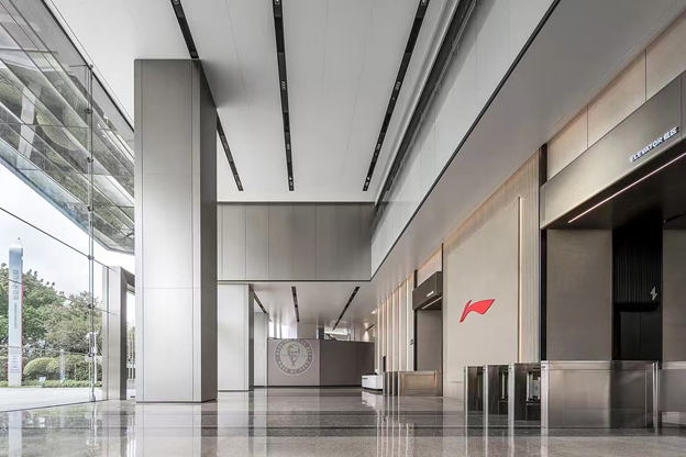 李宁体育用品有限公司的成立给中国人增添了几分自信,创业不易守业难,李宁从一名体操运动员到今天的成就绝非偶然,据说背后有一大佬的支持分不开,他就是健力宝创始人李经纬,李经纬支持李宁创立同名运动品牌,他给从未踏入经商半步的李宁带来了巨大鼓励,要知道健力宝在当时是体育的第一赞助商,健力宝的品牌响遍大江南北,毫不客气说李宁的创立李经纬立下了汗马功劳,没有李经纬就不可能有李宁这个品牌,或者没有如此成功的李宁品牌。 李宁体育用品有限公司办公大楼设计算得上是中规中矩,没有大的花头,一层规划面积1200平,作为一家企业办公楼算得上是十分有派头,本次装修设计为一楼公共区域和展厅,二楼公司食堂,三楼四楼员工区域,6层管理层及董事长办公室,空间布局合理,装修简洁大方,虽没有艺术装饰成分,但一点不失典雅风貌。
